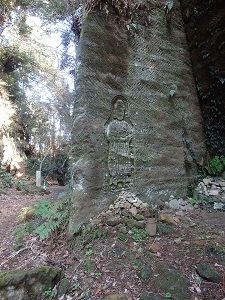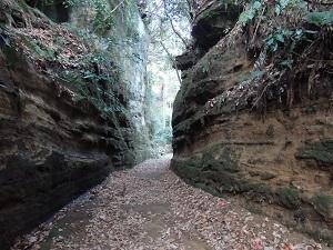 分岐を右(来たときから見ると左)にとり緩やかに登る。だんだん両側の壁が迫ってきて道が細くなり切通らしくなってきます。この道のピーク辺りになると切通のポイントに来ます。崖の一部に仏が彫られたりやぐらがあります。熊野神社に寄り戻ってきたあと(熊野分岐)からさらに3分下ると本日のハイライトの一番切通らしく見えるところに着きます。敵方がここを突破するのはかなり難かしいと思われます。更に4分ほどで、舗装道に出、更に4分で朝夷奈バス停に到着しました。朝夷奈切通は鎌倉七切通の一つで、鎌倉と横浜の六浦とを結ぶ経済的および防衛上の防御施設として重要な道路でした。古道の雰囲気をよく残している切通です