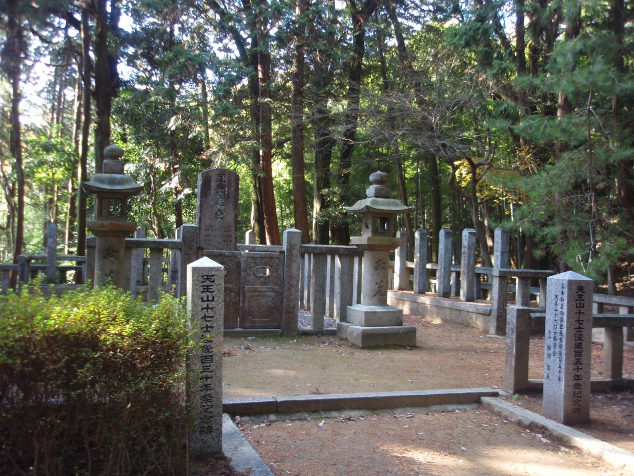 天王山登山途中で十七烈士の墓に寄りました。墓は阪急京都線大山崎駅から少し急な登りを凌いで、40分強(2/3)のところにあります。江戸時代末、蛤ご門の変で薩摩・幕軍連合軍に敗れた長州軍が敗走する際、久留米藩士真木和泉を初めとする十七烈士は、しんがりを努め天王山に立てこもり最後は自刃する。墓は最初、宝積寺にあったのですが、その後現在地に移し変えられました。宝積寺には「殉国十七墓」石碑が建っています。神官であった真木が武士のごとく自刃したのは何故だったのでしょう。歴史に興味ある人には訪れてみては如何でしょうか