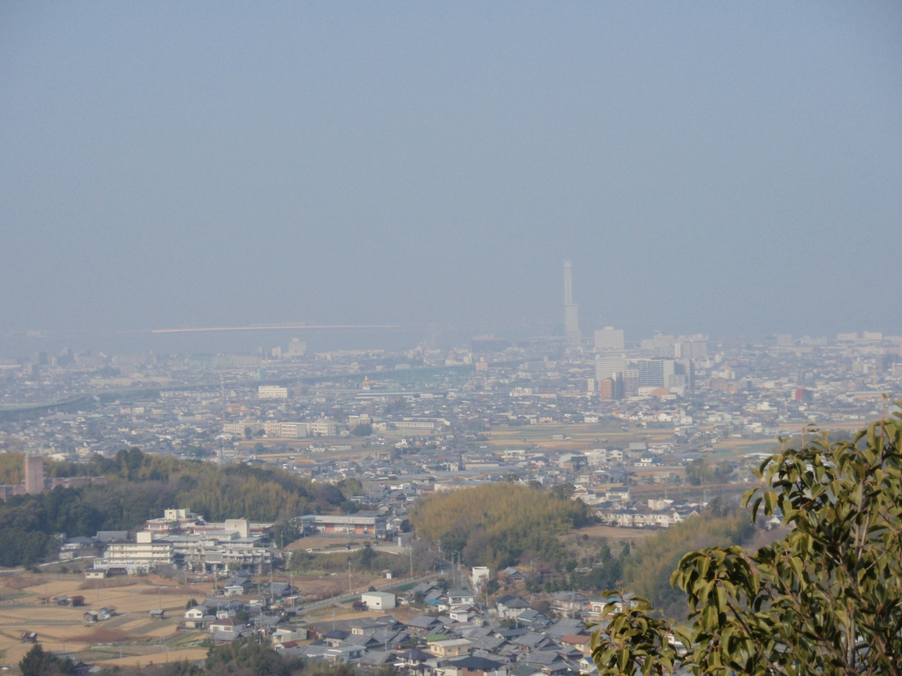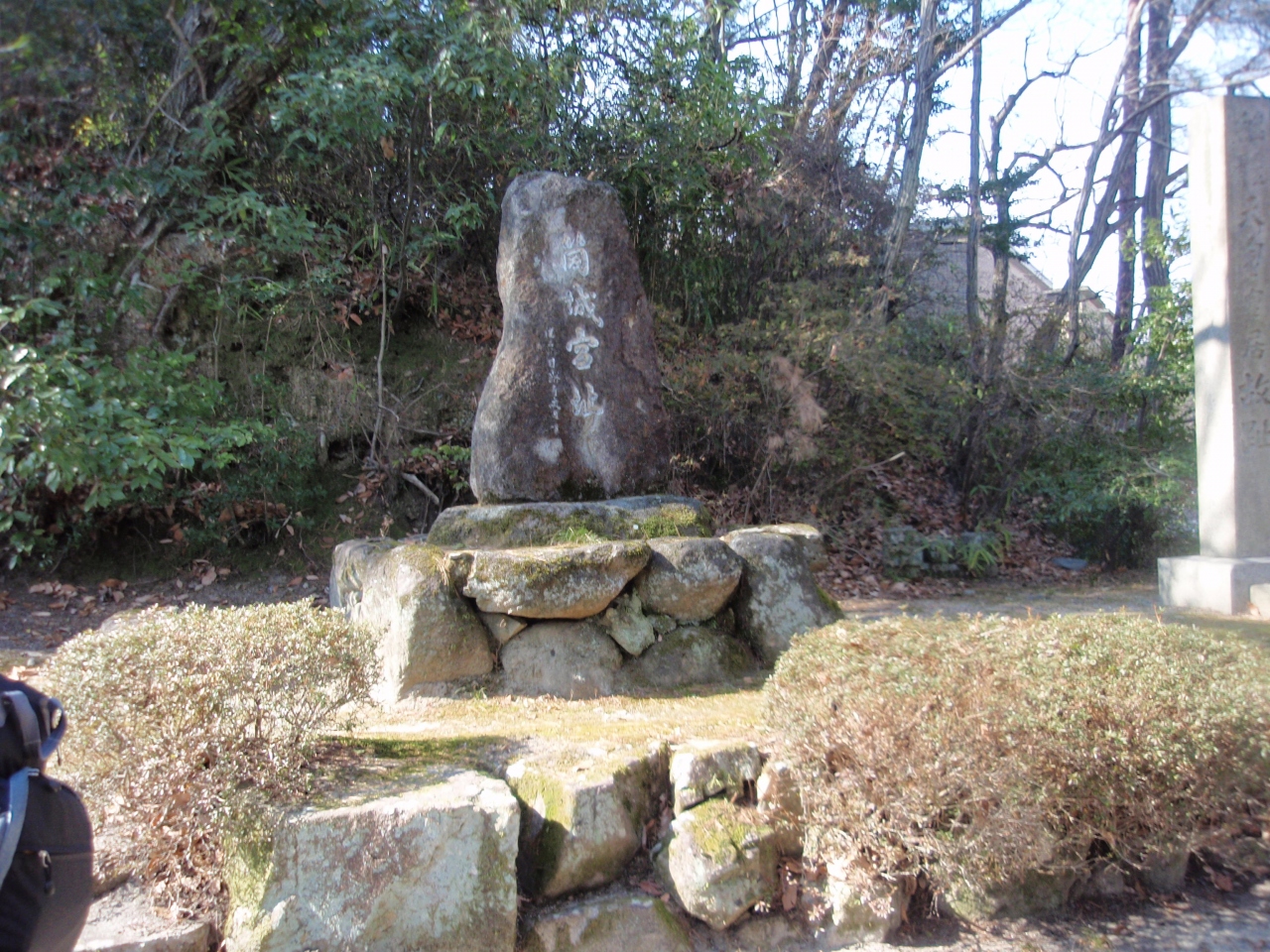 天王山登山途中で旗立松展望台に寄りました。阪急京都線大山崎駅から少し急な登りを凌いで、40分ほど(2/3)のところの展望の開けたところにあります。展望台から大阪、京都市街が見えます。松の木が植えてあり、秀吉が山崎合戦で士気を高めるために千成瓢箪の旗を掲げたところです。明智、秀吉軍の布陣図の説明板があり、良くわかります。また山崎合戦は麓で行われていたのに、ここに「山崎合戦の地」という石碑が建っています。観光用のようです。戦国時代の歴史に興味ある人には必見です