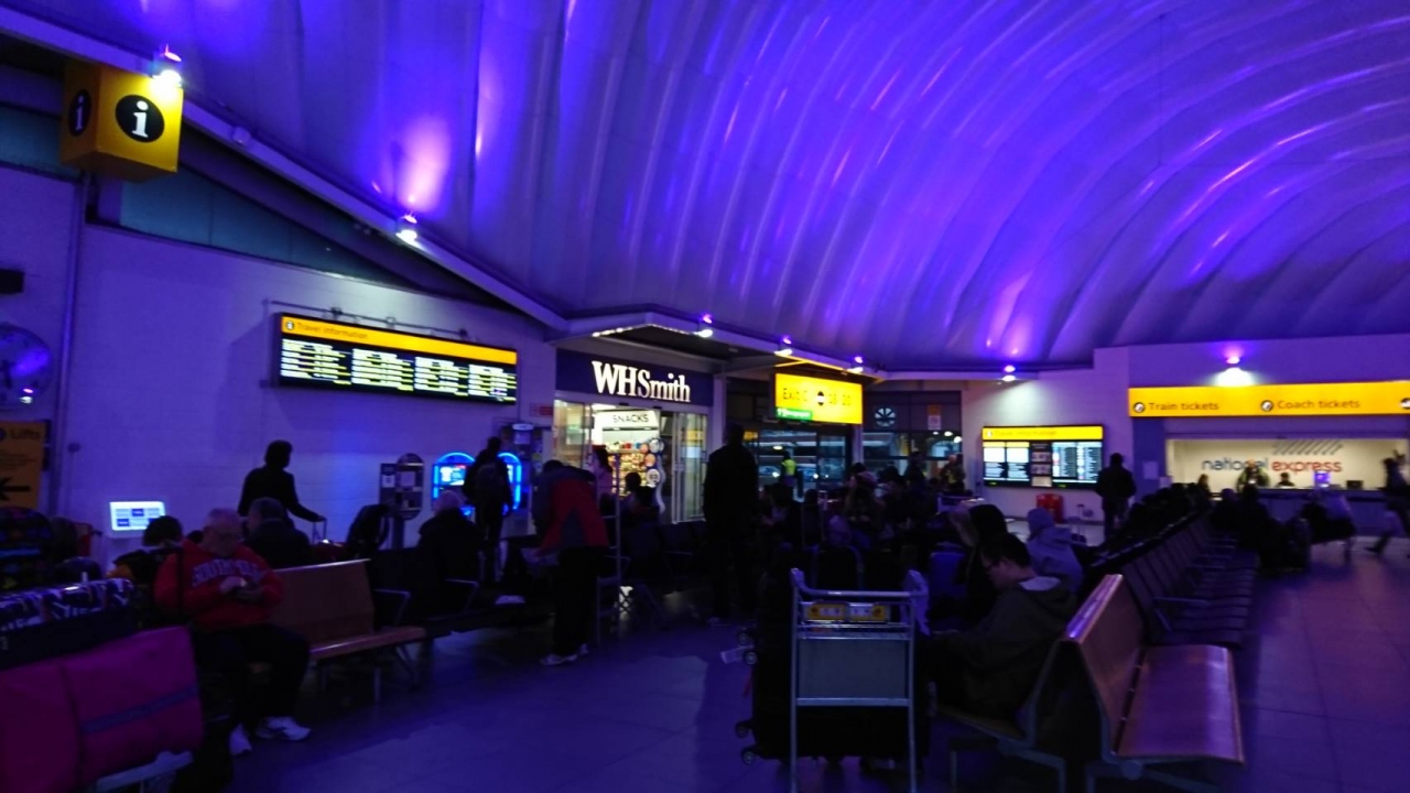 レスターまでのコーチに乗りました。飛行機が遅れるといけないので、余裕のあるバスを選んでいたので3時間くらい待合所でブラブラしていました。