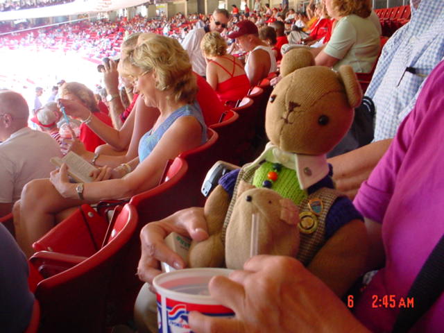 か〜ちゃんは,前日,カージナルスショップで真っ赤なニット(カージナルスのロゴ入り)を購入。応援モード。