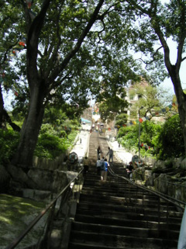 別名「モンキーテンプル」といわれるくらい猿が多く凶暴で持ち物を奪うと聞いてはいたけど、ブッダアイの仏塔まで延々と階段が続くなんて聞いてなかった……。すごい勾配。心臓破り。