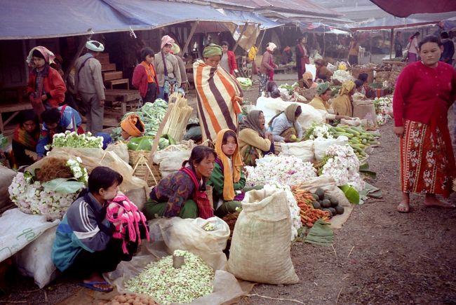 Hehoの5 Dayマーケットへトラックバスの後につかまって行った。途中電車が来てバスはストップした。