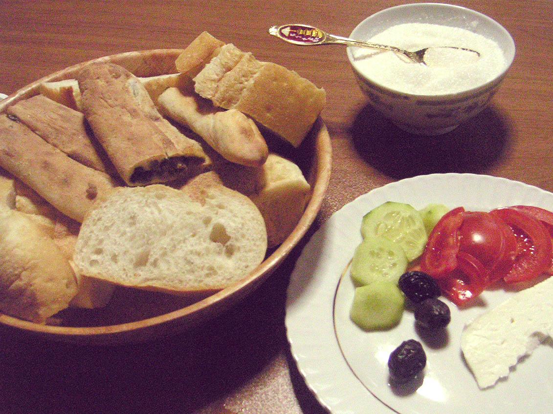 パンヨーグルトキュウリトマトオリーブチーズチャイ