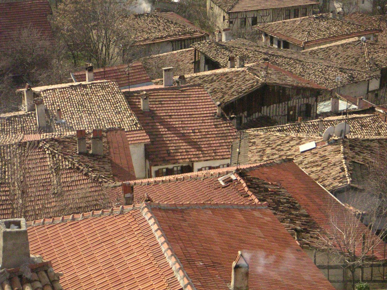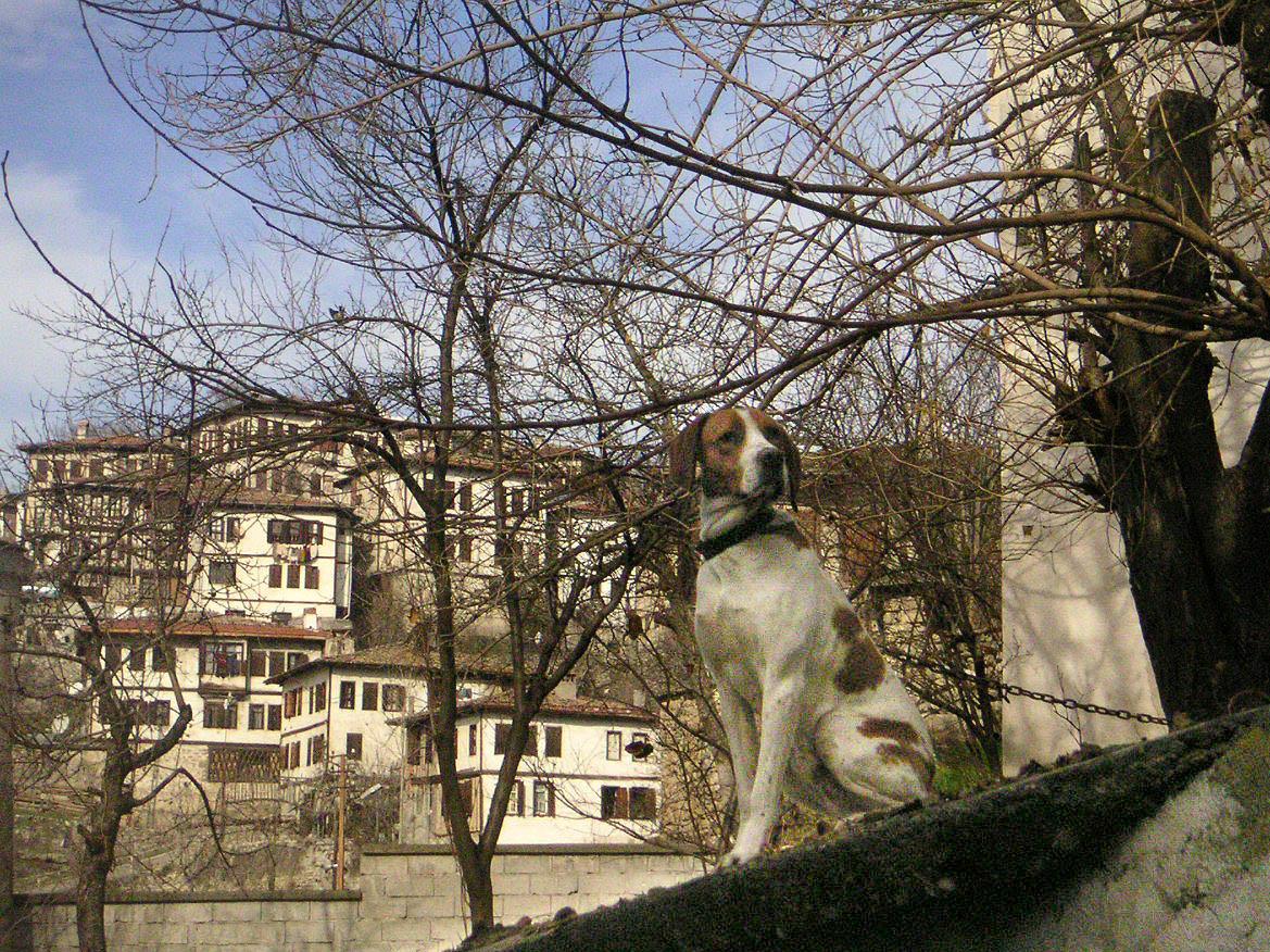 道を散歩しながらふと見ると番犬が。白と茶褐色のまだらなので、木々と茶色い瓦屋根と白い壁の多い街並に、見事に溶け込んでいた。 -