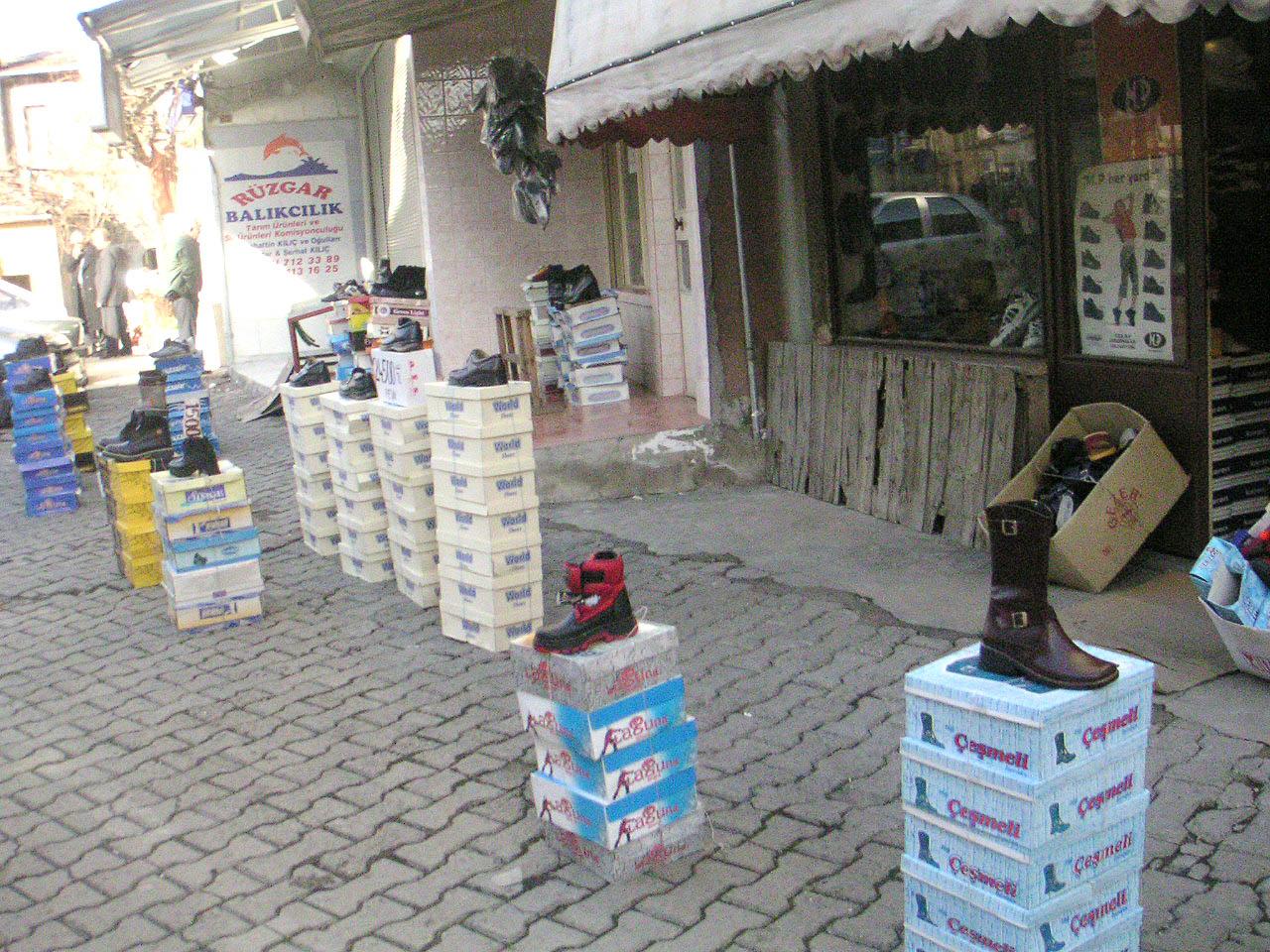 なんじゃこれ!?靴屋の前の道路に箱をつみあげ、「1足ずつ」店頭展示している。しかも、このまばらな距離の取り方、ヤル気がないのか、相当高度なお笑い芸人か、、、、うーん、難解な珍プレー。 -