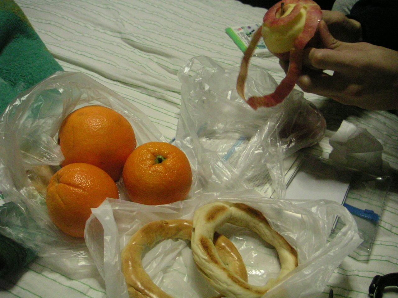 昼食であまりにお腹いっぱいだったので、夕食は抜きにしたんだけど、夜中、お腹が空いてきた・・・。シェアルームだったので、同じ部屋の子と、隣の部屋の子も集まり、クランキョイで買ったリンゴとネーブルを食べる。みずみずしくて、すごく美味しい。空気が乾燥しているのだろうか。やたらと喉が渇いた。 -
