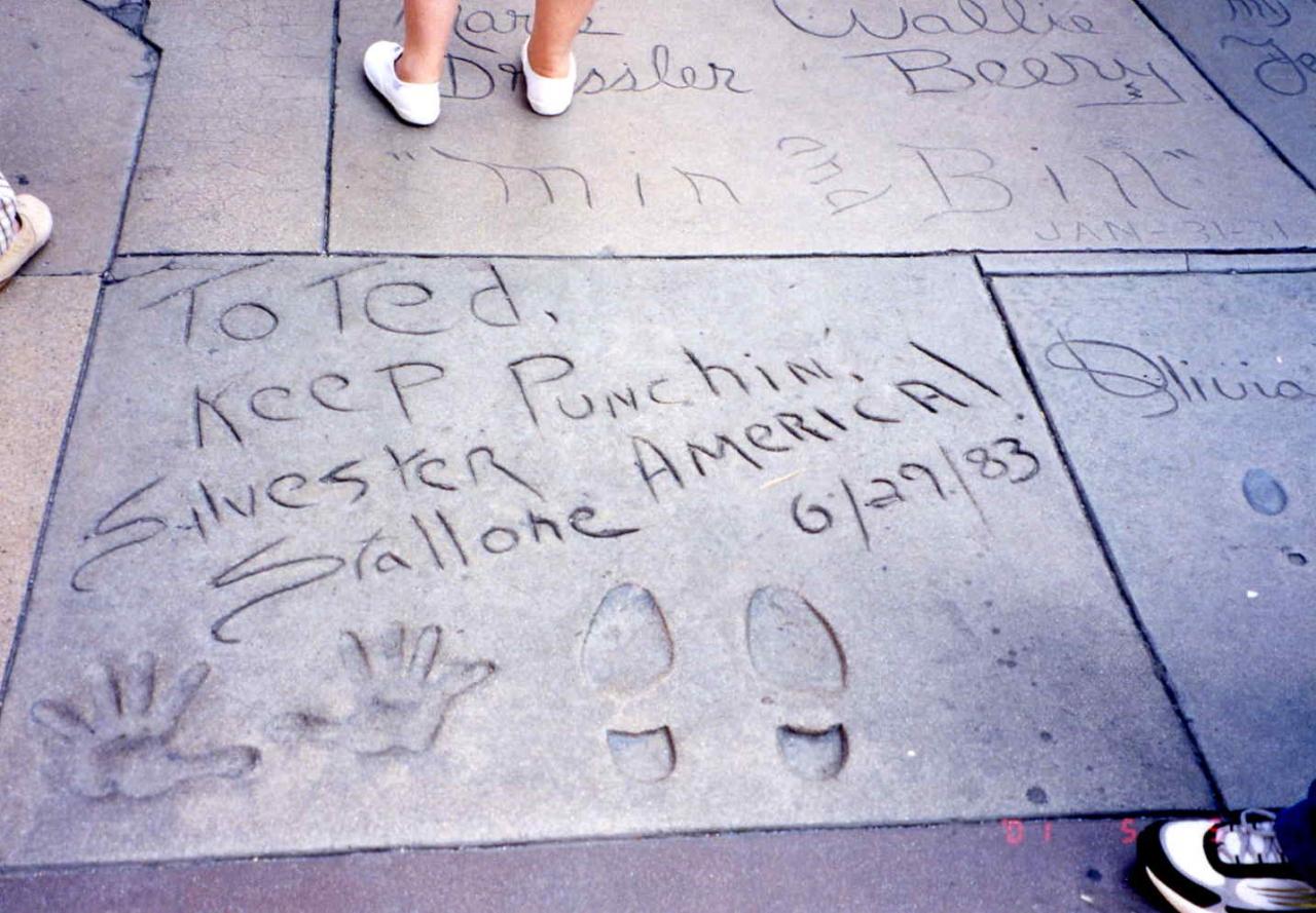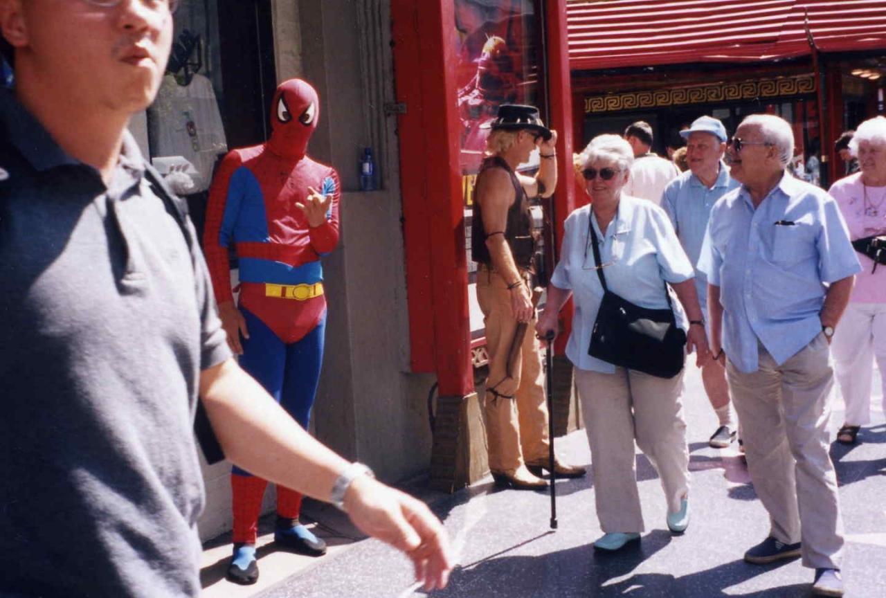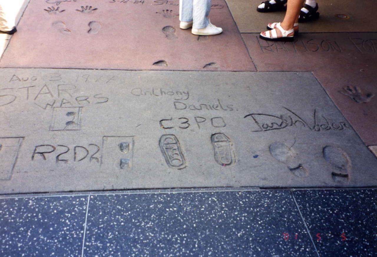 ロサンゼルス国際空港から乗り合いバンでチャイニーズシアター辺りのホテルまで行きました。次の日チャイニーズシアターに行ってみると、いきなりスパイダーマンの格好とインディージョーンズの格好をした変なおじさん達がいました。この人達はこういう格好をして観光客と写真をとって楽しんでるようでした。一緒に写真を撮ってもらっても別にお金は請求されません。道路に有名人の手形、足形をとったタイルが埋め込まれているのですが、映画「スターウォーズ」のC3POのもあり面白かったです。