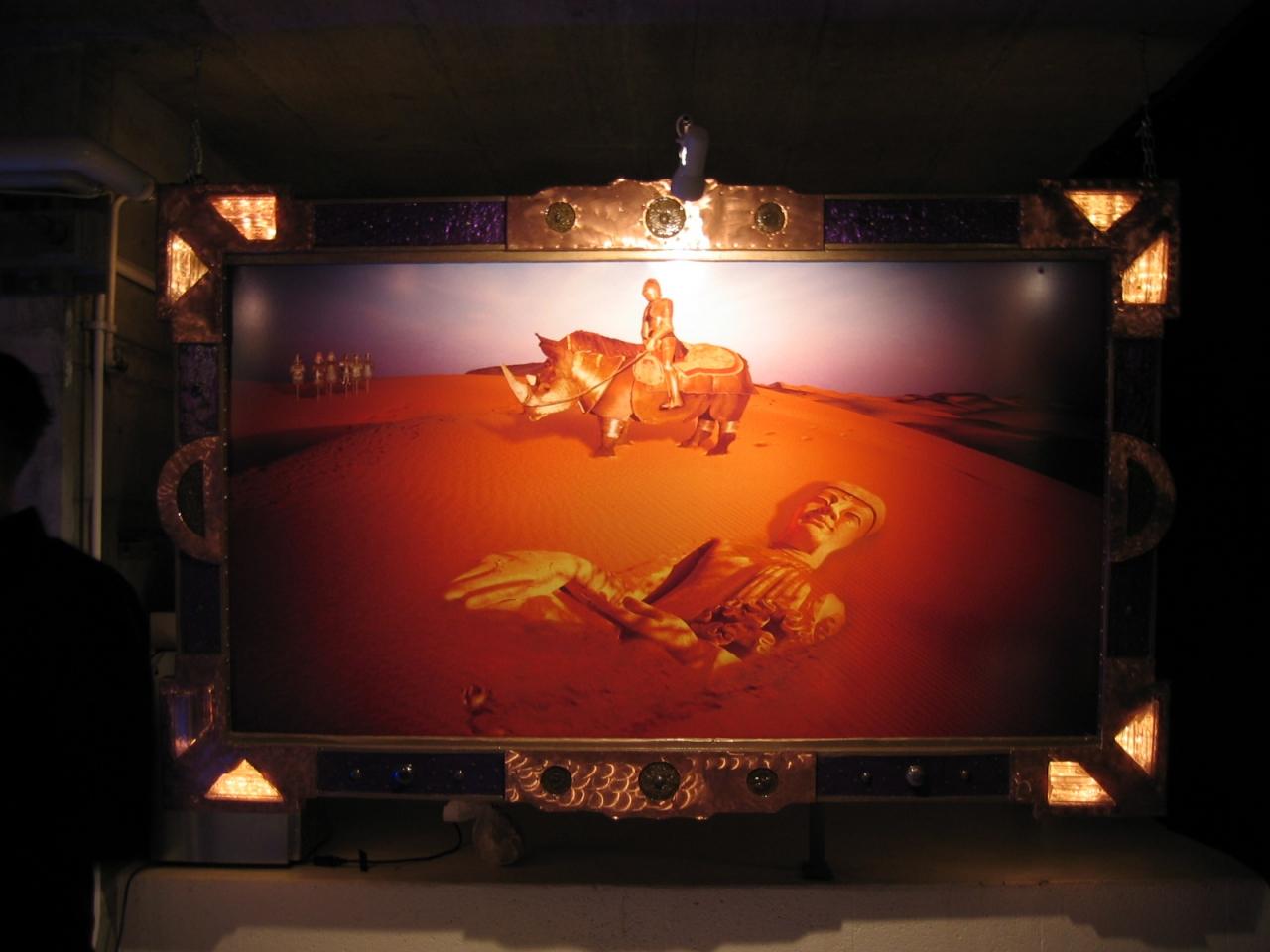 これは公開されていた絵画の一つです。絵の額も、デジタル時計が逆さまに埋め込まれていたり、仏像が左右対象に埋め込まれているなど、おもしろいものでした。