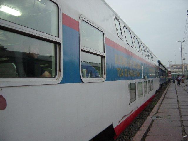 一等車両の様子。二階建てになっている。約100kmの道のりで22000ドンで、旅行会社に支払ったのは2US$だ。安い!