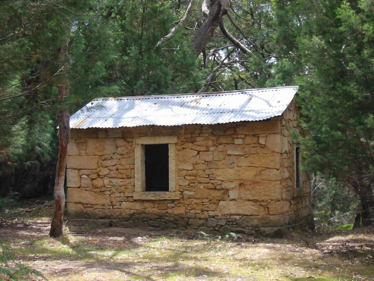 石切職人の住居跡。石を積み上げた3戸が残されている。ゴーストタウンとの説明だが、林に包み込まれて町の面影は薄い。 -