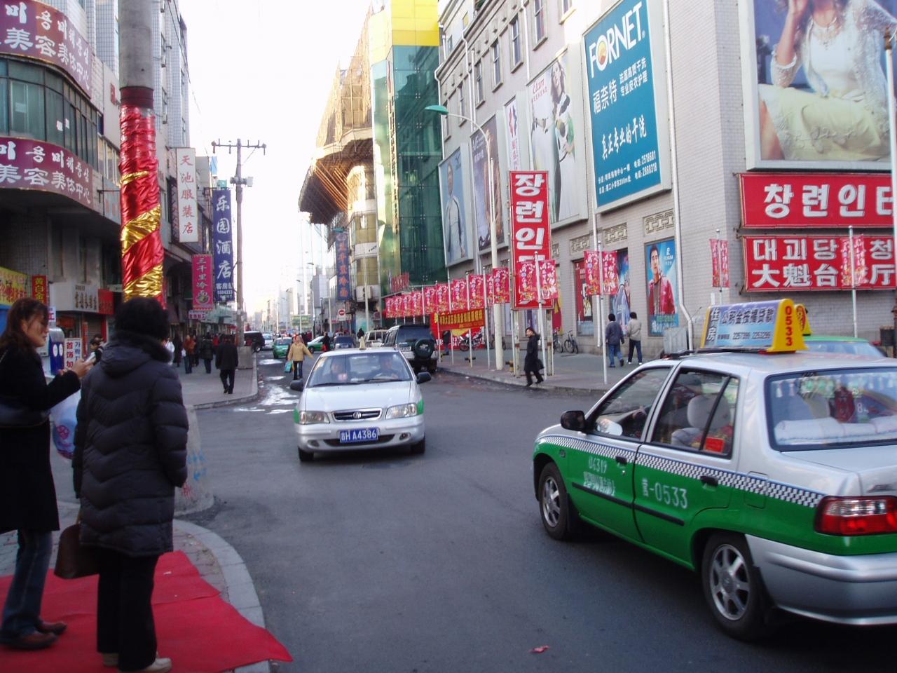 光明街から西に一本入った路が新華街です。写真右に見える延辺日報を右に曲がった地点が新華街南端です。ここから北に向かって100メートルは味のいいレストランでいっぱいです。中央の建物が世紀ホテル、その左のテレビ塔のような建物が青年大厦です。光明街南端右側から西に向けて撮りました。
