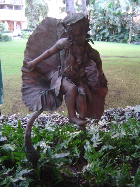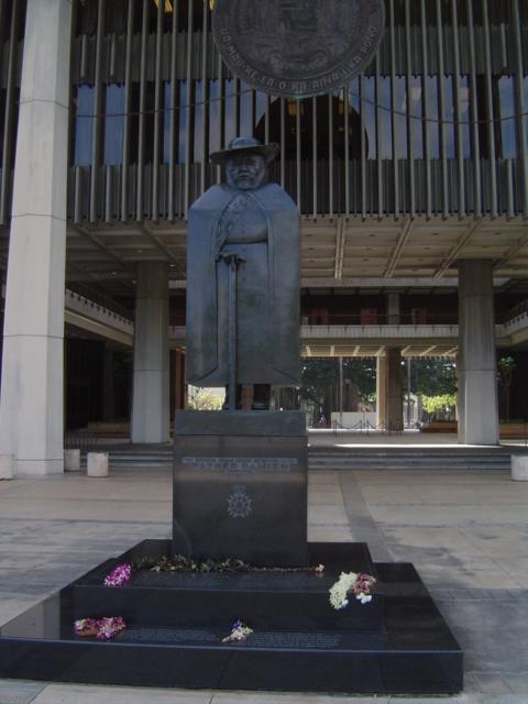 この銅像は、移住者100年祭を記念して1990年にカラカウア通りとクヒオ通りの交差するところにある公園に建てられた。 -