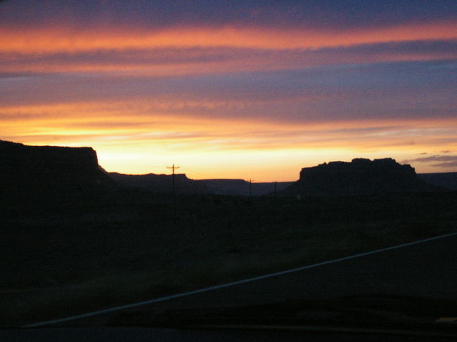 この日は、グランドキャニオンのあとモニュメントバレーへ行く予定でいたのですが、到着目前で、日が暮れてしまって見る事が出来なくって・・・(;_;)だから仕方なく「ページ」まで行く事に・・・。行きバーガーキングによって大好きなシュリンプサラダを買って車の中で食べて、夜中、ページに到着。ココの町は湖があって周辺にはボーリング場・バーなど栄えていて夜中なのに結構人が歩いてたりしていい感じでしたよん!!