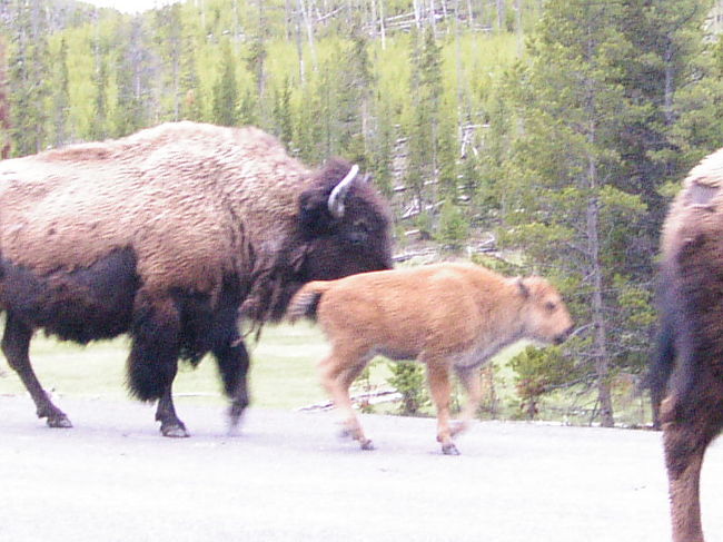 へ向けて出発!!89号を進み「Grand Tetone National Park」を通過してYellow Stoneへ・・・・。到着は出発から2時間半くらい後かなぁ〜、まず、Old Faithfulから見るとして走ってたら「ぎやぁぁぁぁぁ!!!!!!」助手席の真横(ホントスレスレ)を「バファロー」がっ!!!!美・ビックリどころの騒ぎじゃなかったよ!まったく。だって、本物見たこと無いからホントにいるかも私の中で定かではなかった動物が真横にいるんだもん!! その後も鹿さんが登場したりと、自然を大満喫!!サファリパークに行った事ないけどこんな感じ!?こっちの方がすごいかも!?そうこう、楽しみながらOld Faithfulに到着しました。