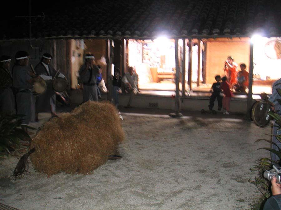 夜、浴衣と鉢巻姿の男達と一緒に獅子が登場。家々を巡る度に振舞われたお酒を飲む獅子舞。おばあが島言葉で獅子に話しかけているが、私には意味不明。でもその風景がとても良かった。 -