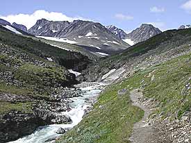 初めは深い谷の中を行きます。上部に氷河があるせいか水量のおおい谷です。