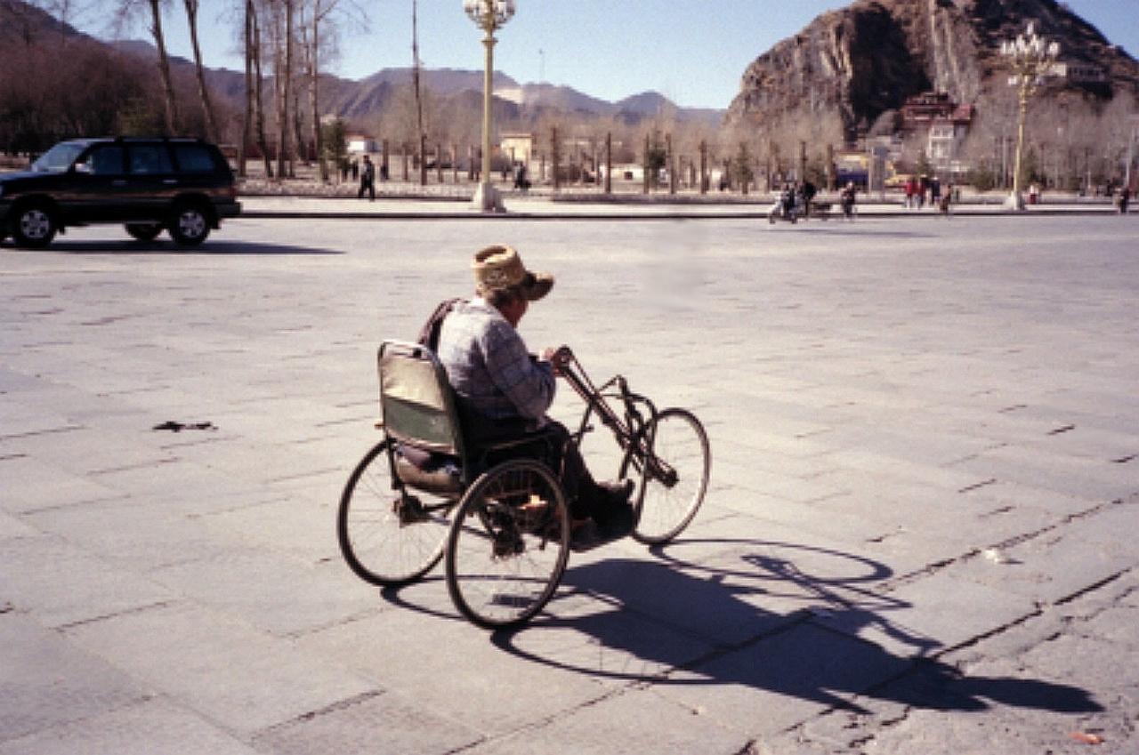 ポタラ宮の裾を行く手漕ぎ三輪自転車。