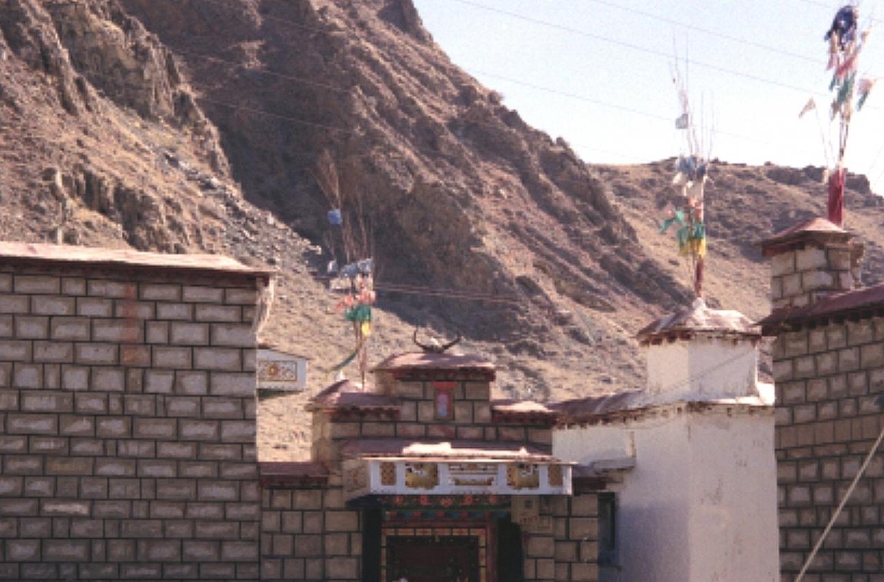 タルチョを戴き白い壁を連ねるチベット住居。 -