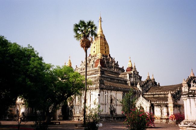 数あるバガンのパゴダの中でも、その美しさでは筆頭にあげられるアーナンダ寺院。端正な建物、白壁と黄金の塔のバランス、気品にあふれた美しさです。
