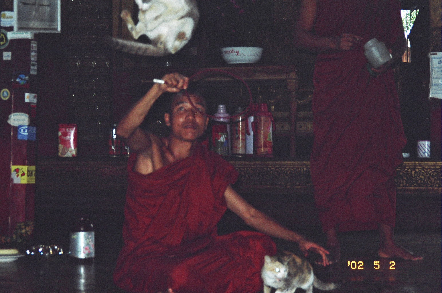続いて訪れたのがガーペー僧院。別名「ジャンピング・キャット・モナストリー」。それなりに由緒ありげな僧院ですが、観光客のお目当てはネコ達。広い僧院内を駆け回っていますが、お坊さんが差し出す輪っかをピョンと飛び跳ねくぐってみせます。写真は実に見苦しく恐縮です。この1枚しかとっていなかったものですから。元画像に拡大していただくとわかるかと思いますが、上の方に見える白い毛玉がネコです。輪っかをくぐった後体を丸めてストンと着地します。まあ、それだけのことと言えばそれだけのことです。ネコ好きの私は結構楽しめました。