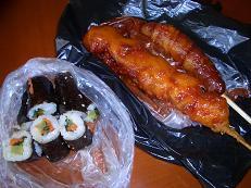 屋台のキンパとコチジャン味のチキン(衣はホットドックの皮の味)とベーコン巻きフランクフルト☆
