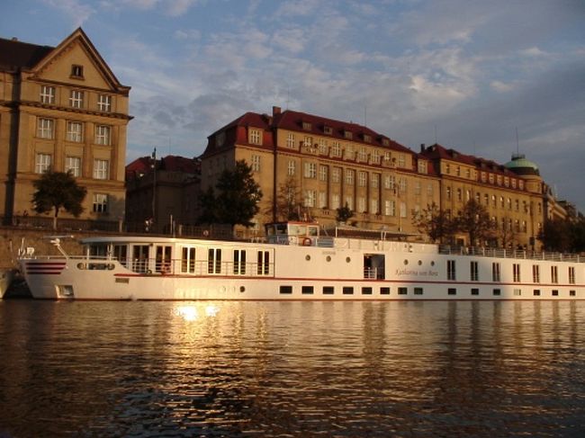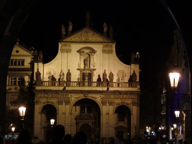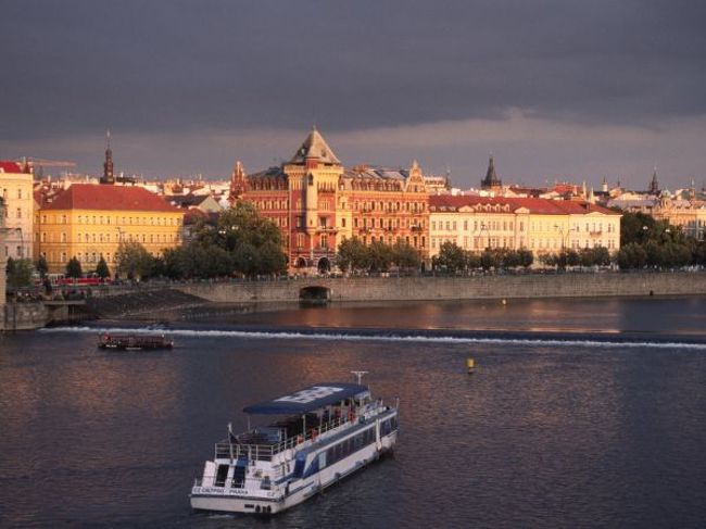 プラハに到着後、カレル橋の方に行くと、暗い雲を背景に、夕日に照らされた建物が・・・。