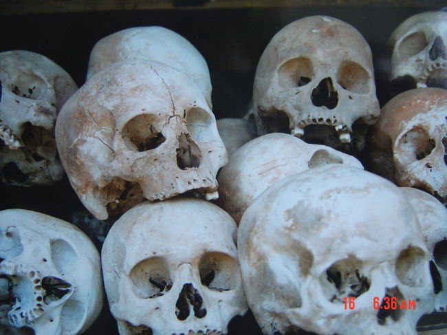 何層にも展示された頭蓋骨.ここのキリングフィールドを管理して居る会社は日本人経営だとか....?