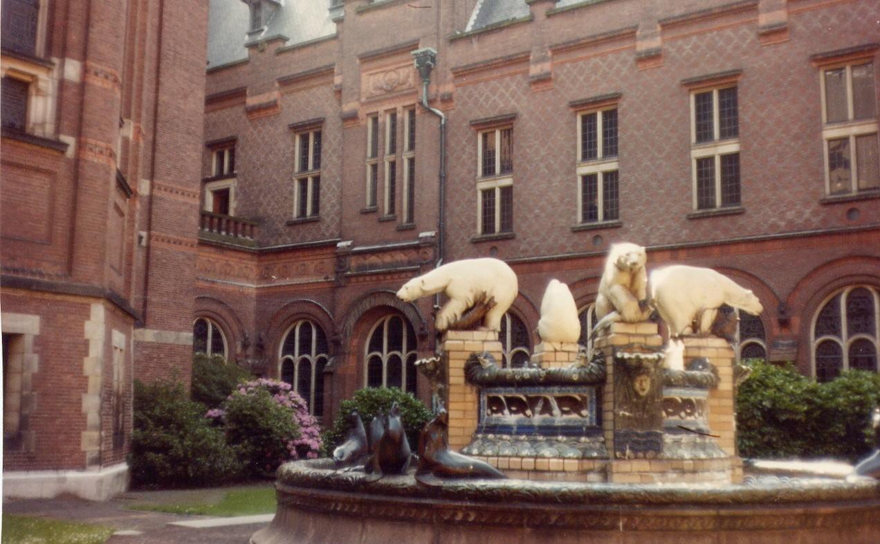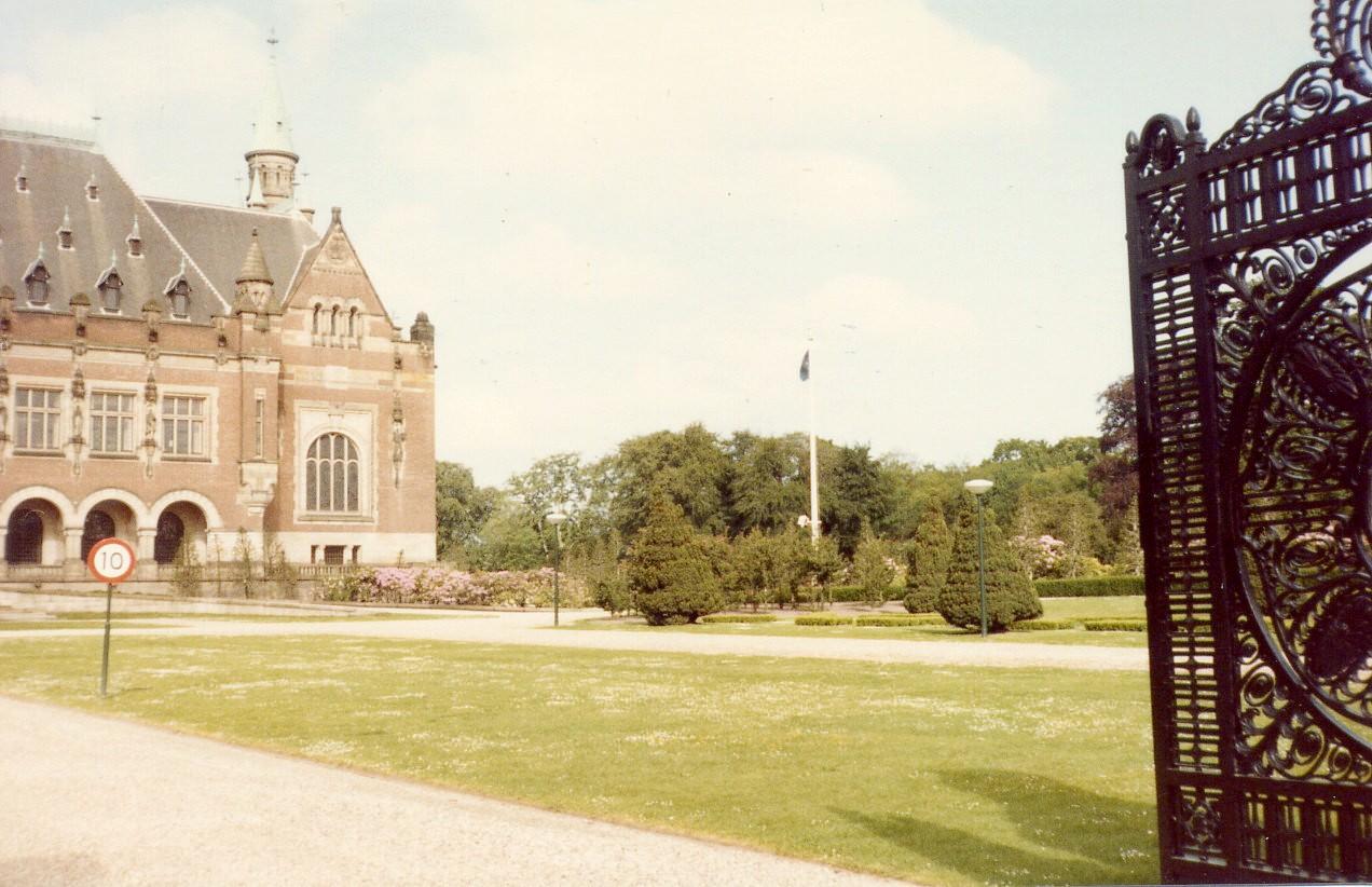今朝は外は寒く、朝の散歩もやめる。ハーグの平和宮殿へ向かった。ステンドグラスが綺麗な法廷、ソ連から贈られたという、白熊の彫刻のある噴水、日本から贈られた西陣織の織物で飾られた日本間・・。国際紛争について協議するために建てられたものとか。