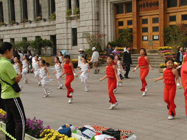 広場の一隅に...女子の「縄跳び大会」が...始めて見る「縄跳びテクニック」です。音楽にあわせて団体で演技を楽しんでいます。