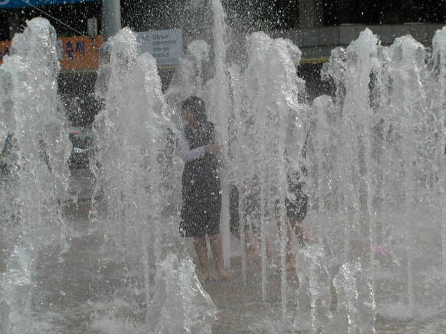 噴水が、地面から...そこに女子高校生が!飛び込み参加に興じる!!しばし、元気に走り&飛び込み、ズブ濡れのショットを....無邪気に!いい光景!? -
