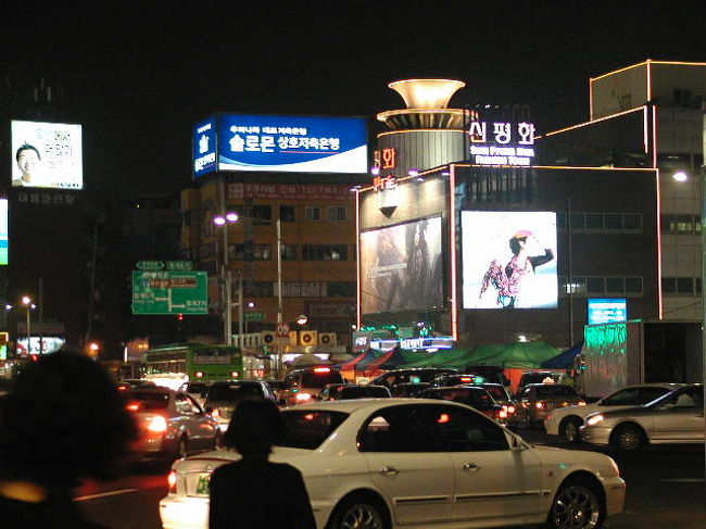 ホテルに着いたら、即徒歩10分の東大門繁華街に出動...道路を挟んで「手前:露店&夜食店と向こう側にDOTTAファッションビル」が! -