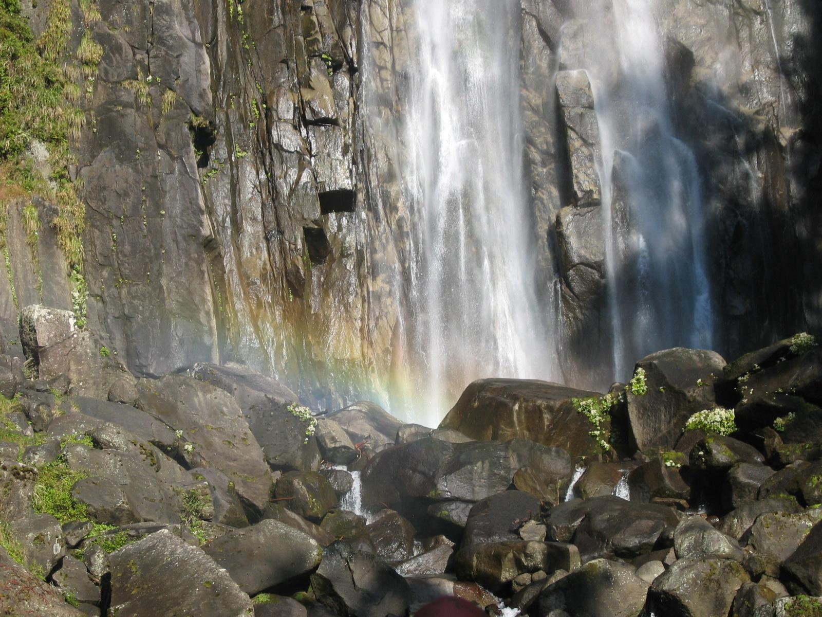 木々で薄暗くなった階段を下りていくと、光の差している大きな滝が見える。