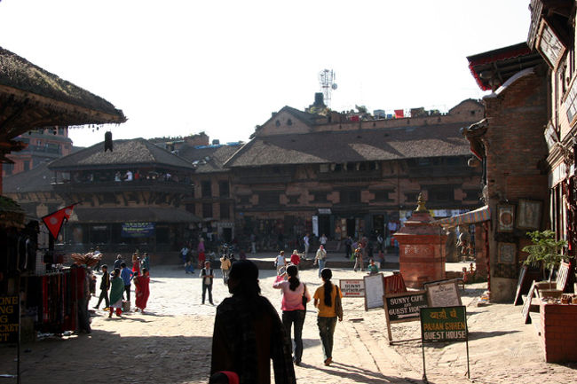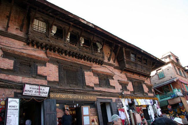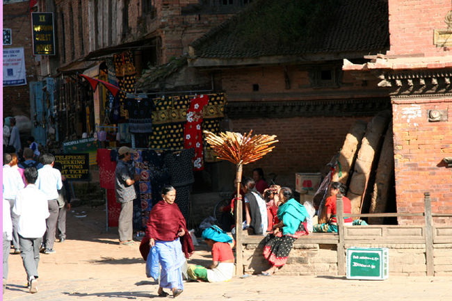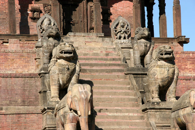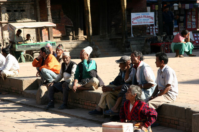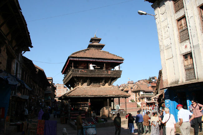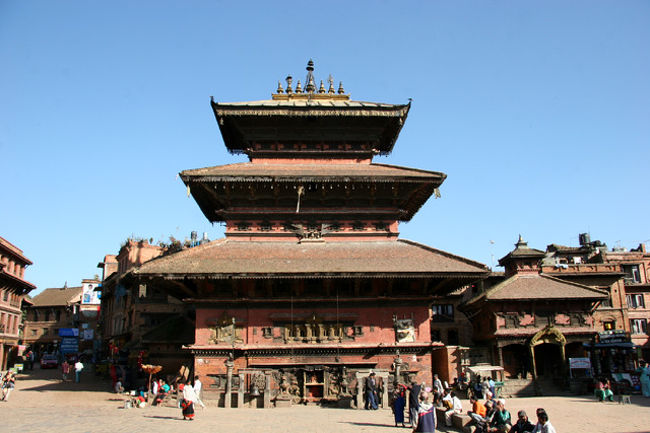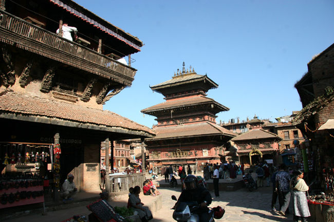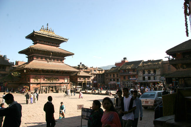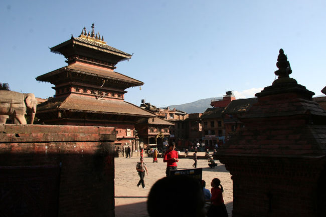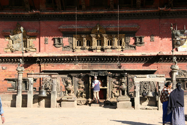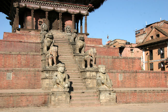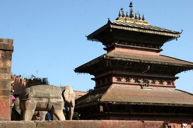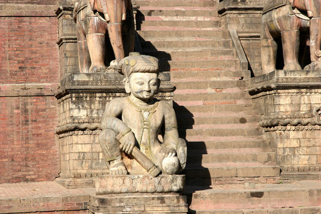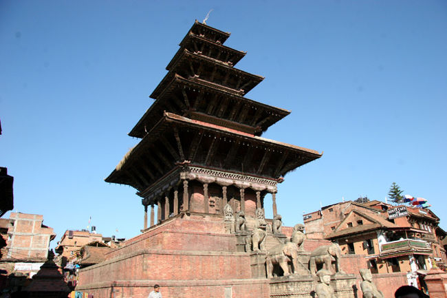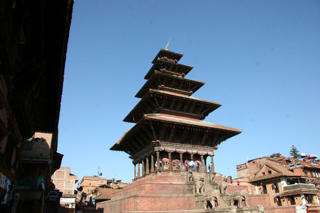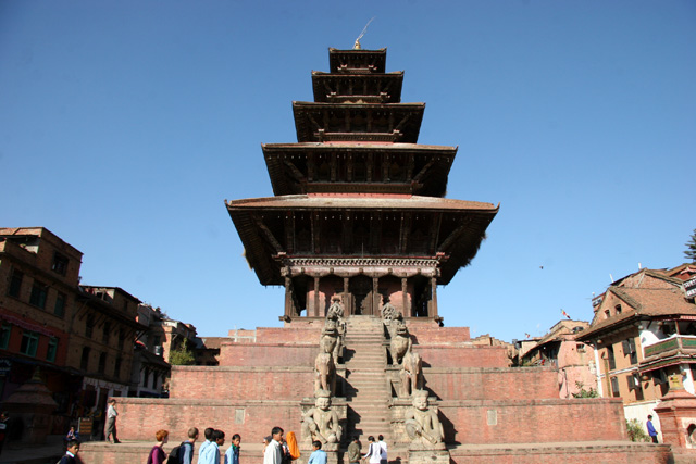 広場で目立つのがニャタポラ寺院の五重塔。18世紀に建てられたという高さ30mのカトマンズで最も高い塔である。正面の石段には伝説上の戦士や獅子、グリフィン、女神の石像が守護神として置かれている。観光客はそんなに多くはない。地元の老人たちが憩いの場として座り込んで話をしていた。
