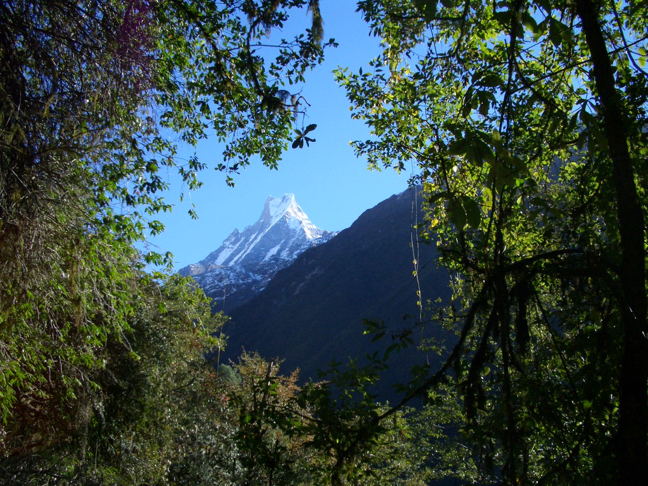 霊峰マチャプチャレ(6993m)は三角形からその名の意味する「魚の尾」といわれる。