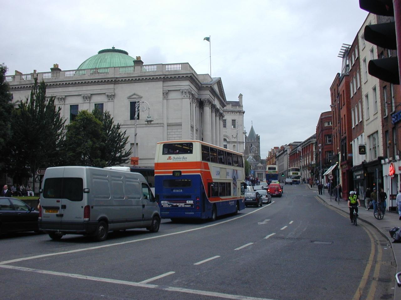 空港へ向かう途中で遭遇−市内観光バスです。日本でも見かけるようになりましたが、2階部分がオープンになっています。7月とはいえやや肌寒い(自分には)感のあったダブリン、冬場は屋根がつくのかな。。