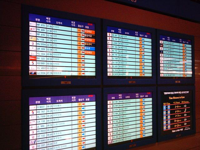 インチョン空港に到着し、入国せずに乗り継ぎゲートを過ぎ出国フロアへと上った。今夜の出発便も残りわずかの案内板には翌朝の便も載っている。