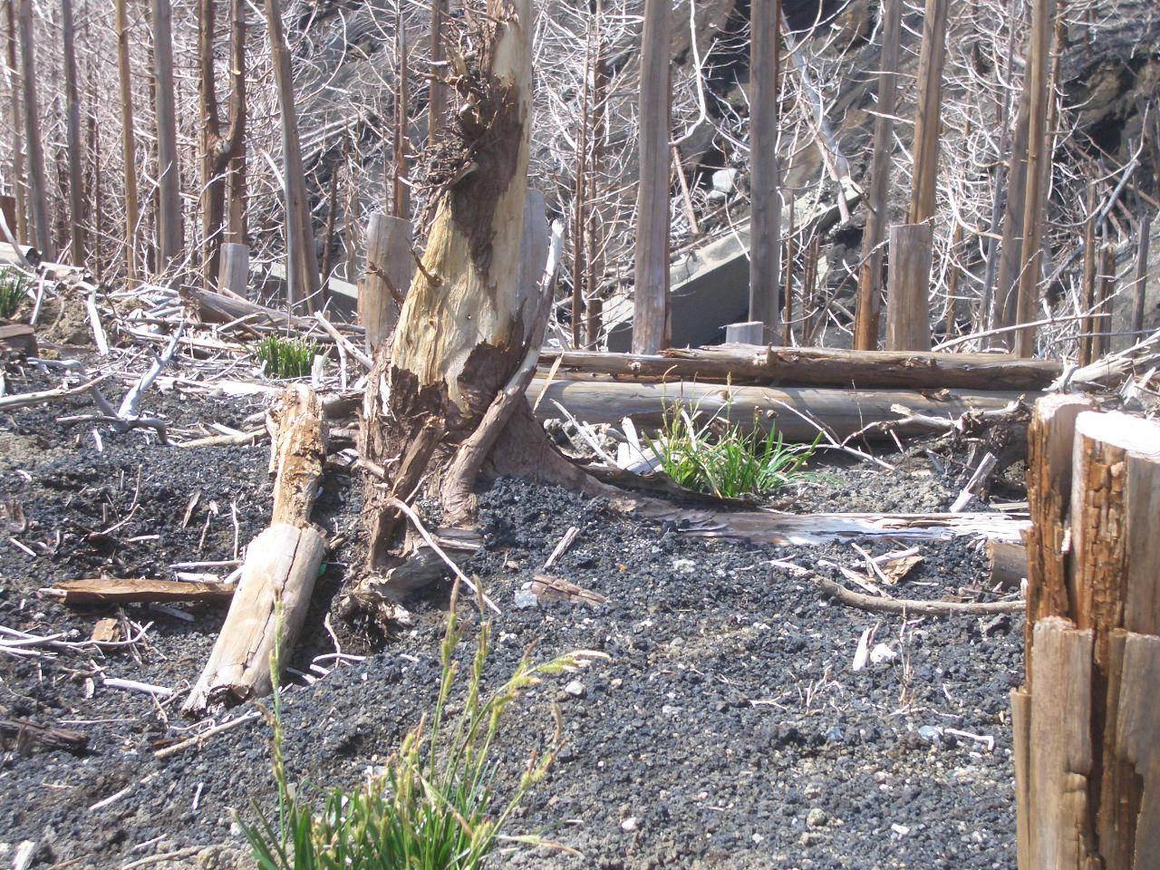 枯れ木の根はあまりに浅くもろい。火山灰により熱せられたのでしょう。