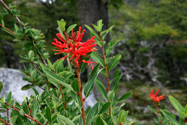 パタゴニアでは花が少ない・・。風の大地と云われている風土では特殊な花だけが生き延びているのだろうか。家庭花壇ではそれなりに一般的な草花が見られるが、野生の花としては赤い房状のノートロという花くらい。カラファテという鋭い棘を持った小灌木が夏に黄色の花を咲かせるそうだが今は鋭い棘だけ。パタゴニアでよく見る木は南極ブナで風雪によく耐える。強い風に吹かれて靡くような形で成長している姿が面白い。