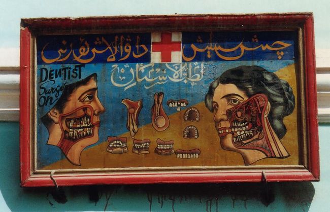 カシュガルの街には個性的な絵看板がたくさんあった。中国語やウイグル語が通じない少数民族が多く、文字を読めない人も多いため、誰が見てもわかるように店の看板には絵が描かれているのだそうだ。