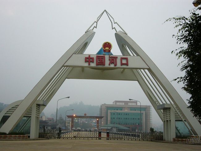中国とヴェトナムとの国境の町「河口」(中国側)の国境ゲートからヴェトナムの国境ゲートを望む。