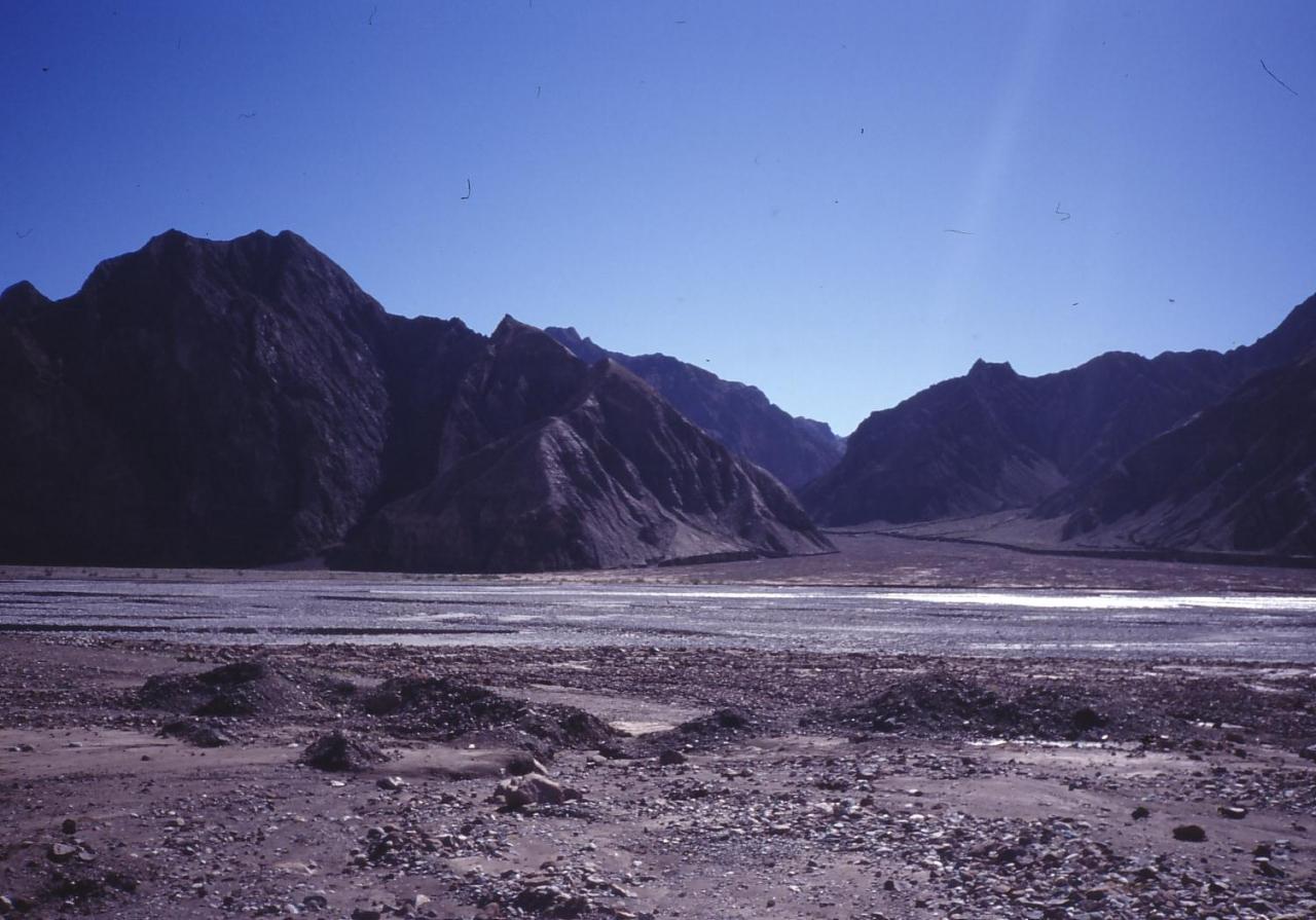 カシュガルから有名なカラクリ湖を越え,中国最西端の街タシュクリガンへ.ここでバスを乗り換えて,クンジュラブ峠を越え,山脈の間を縫うようにカラコルムハイウェーを下ると,パキスタン側の国境検問所のあるスストに到着します.かつては世界三大バス悪路などと呼ばれていたこともあるらしいカラコルムハイウェーですが,基本的に「舗装」された道路ですので,バスのサスペンションが多少粗悪でも,我慢はできると思います.もっとも,いつ崖崩れでバスが下敷きになっても,またバスの運転手がハンドル操作を誤って,川に落ちちゃったとしても,不思議ではないような道路でしたが・・・