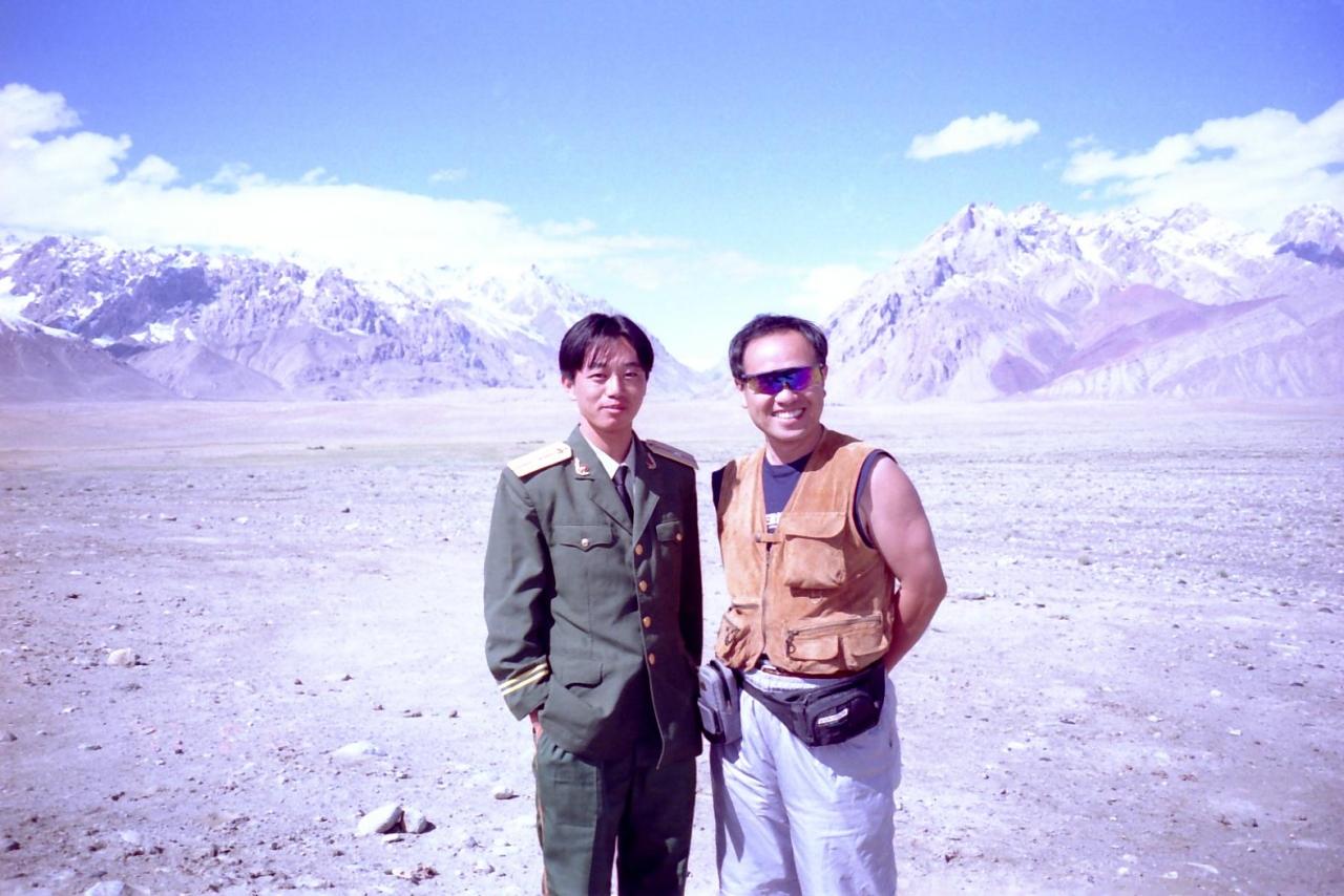 途中でバスに乗り込んできた人民解放軍の若い兵隊さん(右のおじさんじゃありません).筆談によると,山東省から2年間の予定で,この地に派遣されているそうです.まさに現代の防人.この若い兵隊さんは,クンジュラブ峠のちょっと手前にある中国軍の施設の前でバスを降りていきました(パラボラアンテナがあったけど,TV放送も見られるのでしょうか?).