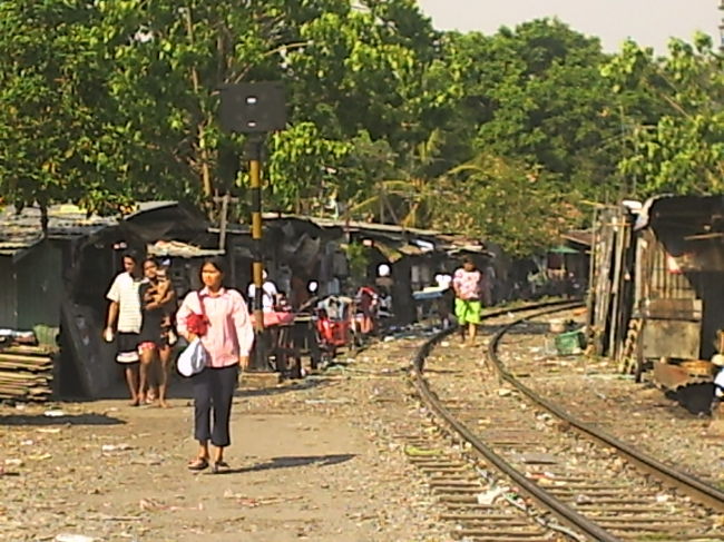 鉄道素家群(スラム)の後ろには、すぐ街の新しい建物が迫っている。それに押し潰されるのは時間の問題のようであり、この風景が無くなるのもチョット淋しい気もするが・・