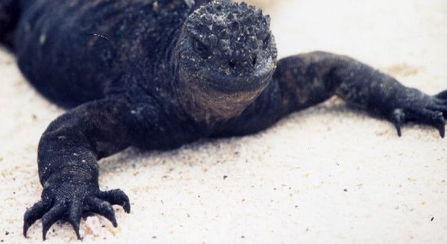 上陸する砂浜には、すり鉢状のウミガメが、卵を産みつけた後が見られる。ここはリクイグアナの保護区。指定された歩道を進むと、ウチワサボテンの下で餌にかぶりついているイグアナと出くわす。グロテスクな顔つきもだんだんと可愛く見えてくる。