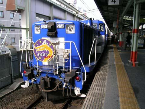 起きた時間が予定より少し遅く、しんじ湖温泉の足湯に行って湯治する時間がなくなった。時間が中途半端なので、とりあえず松江駅に向かう。しばらくして奥出雲おろち号が入線してきた。牽引するのはめずらしくDE15で、ヘッドマークにはヤマタノオロチ。