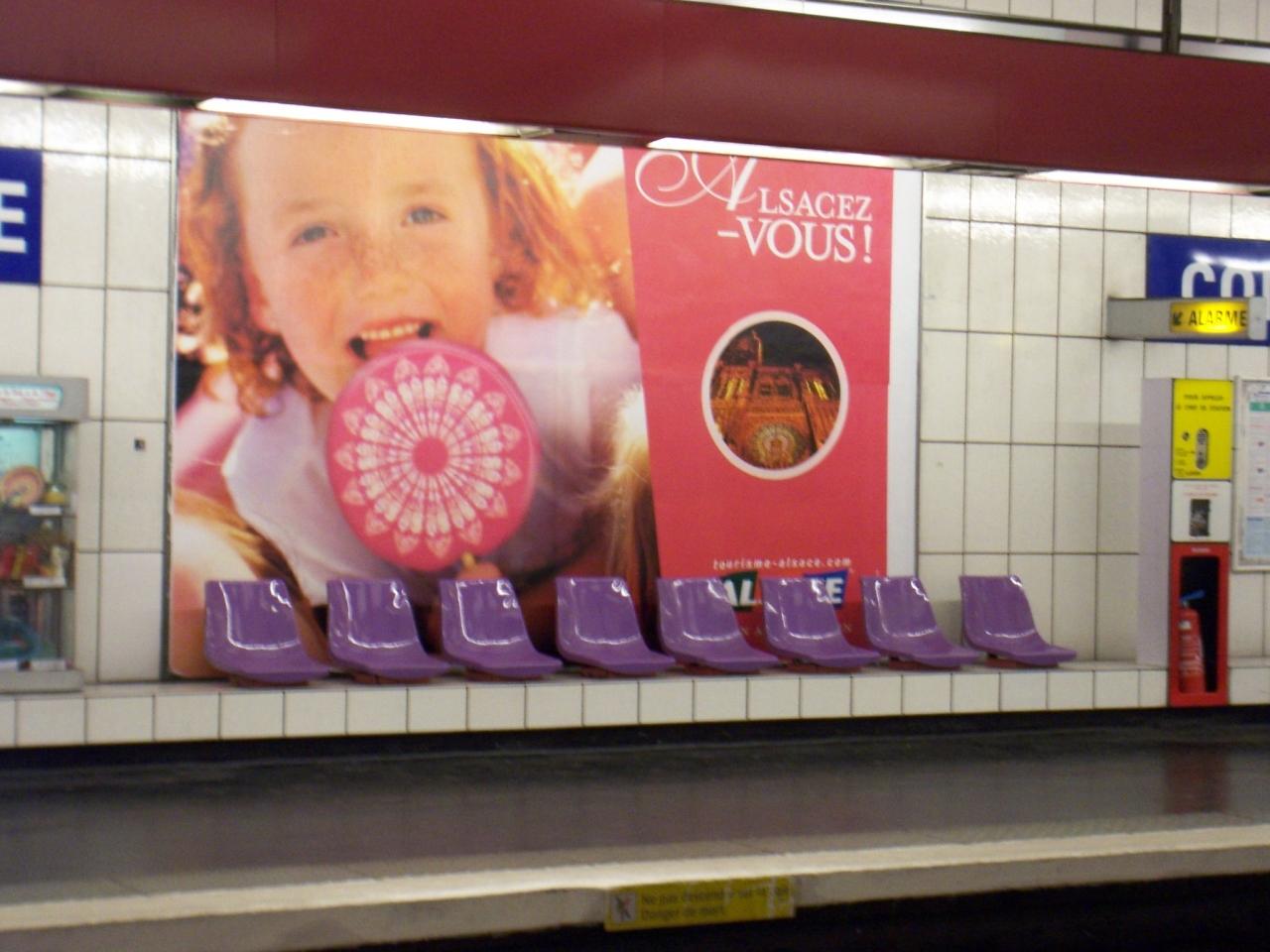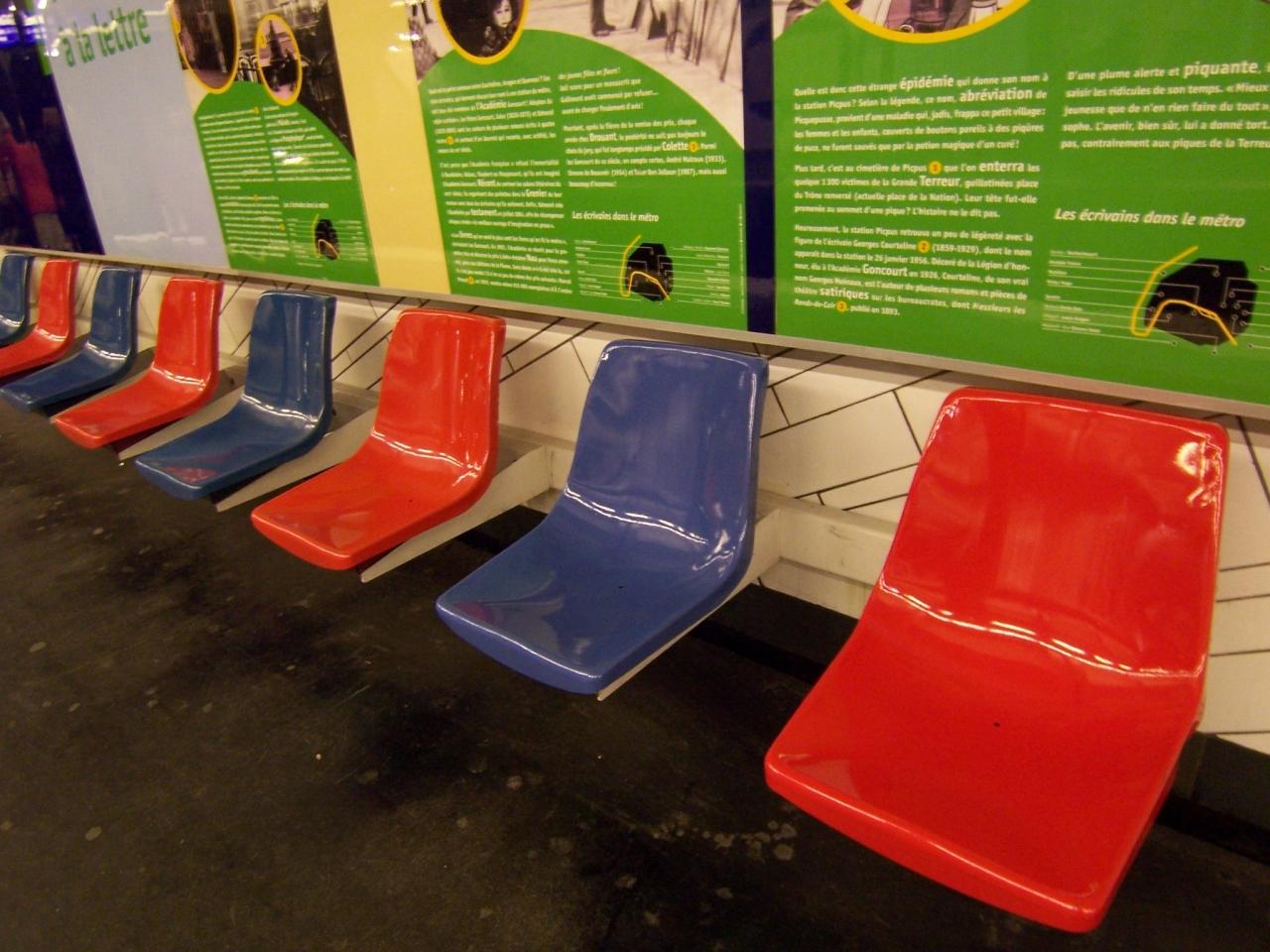 地下鉄のホームの椅子の色が駅によってさまざまできれいでした。 -