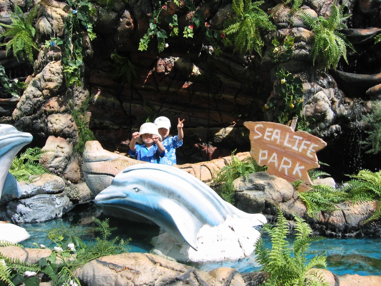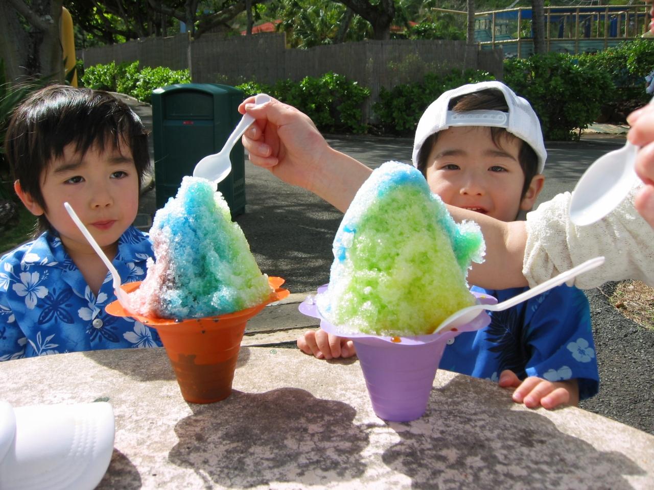 シ−ライフ・パ−クでカキ氷。僕たちの顔より大きい。3ドルなり。(お店のおばちゃんの豪快な盛り方で子供たちが感動。結局イルカショウ見ないで食べてました。)