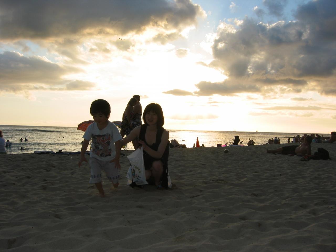 ワイキキ・ビ−チの夕日(ハワイアンが流れて気持ちよかった。)