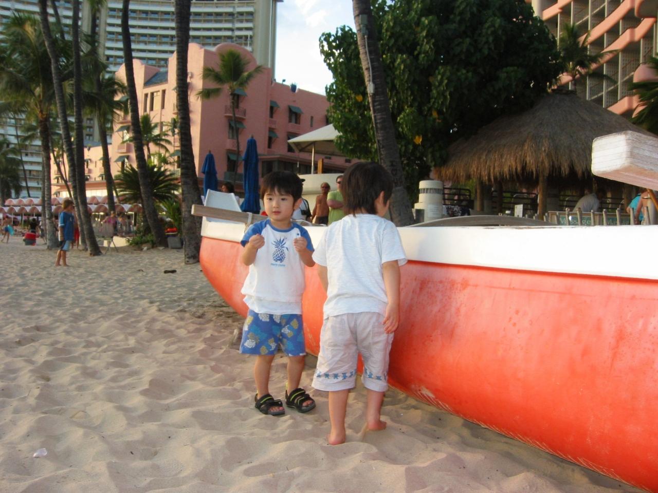 カヌ−クラブ前のビ−チに大きなカヌ−! 30分ずっと砂を入れてた。